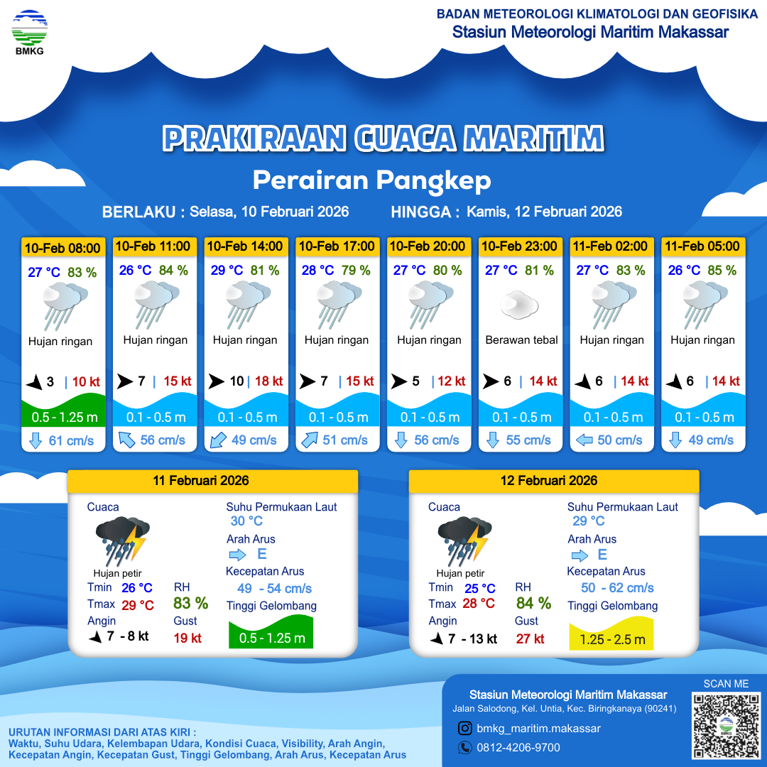 10 Feb 26, 23.00 6 jam kedepan | Barat Laut 8 kt Gust Peningkatan kecepatan angin yang singkat dan tiba-tiba : 15 kt | 0.5 m Rendah | Selatan 51.0 cm/s | 26 °C | 85 % |