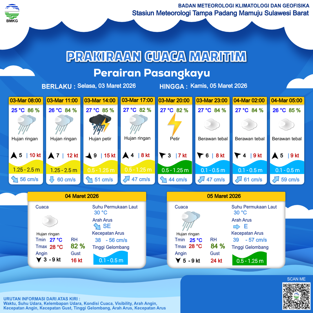 3 Mar 26, 09.00 11 jam kedepan | Timur 2 kt Gust Peningkatan kecepatan angin yang singkat dan tiba-tiba : 8 kt | 0.8 m Rendah | Timur Laut 47.0 cm/s | 27 °C | 82 % | |