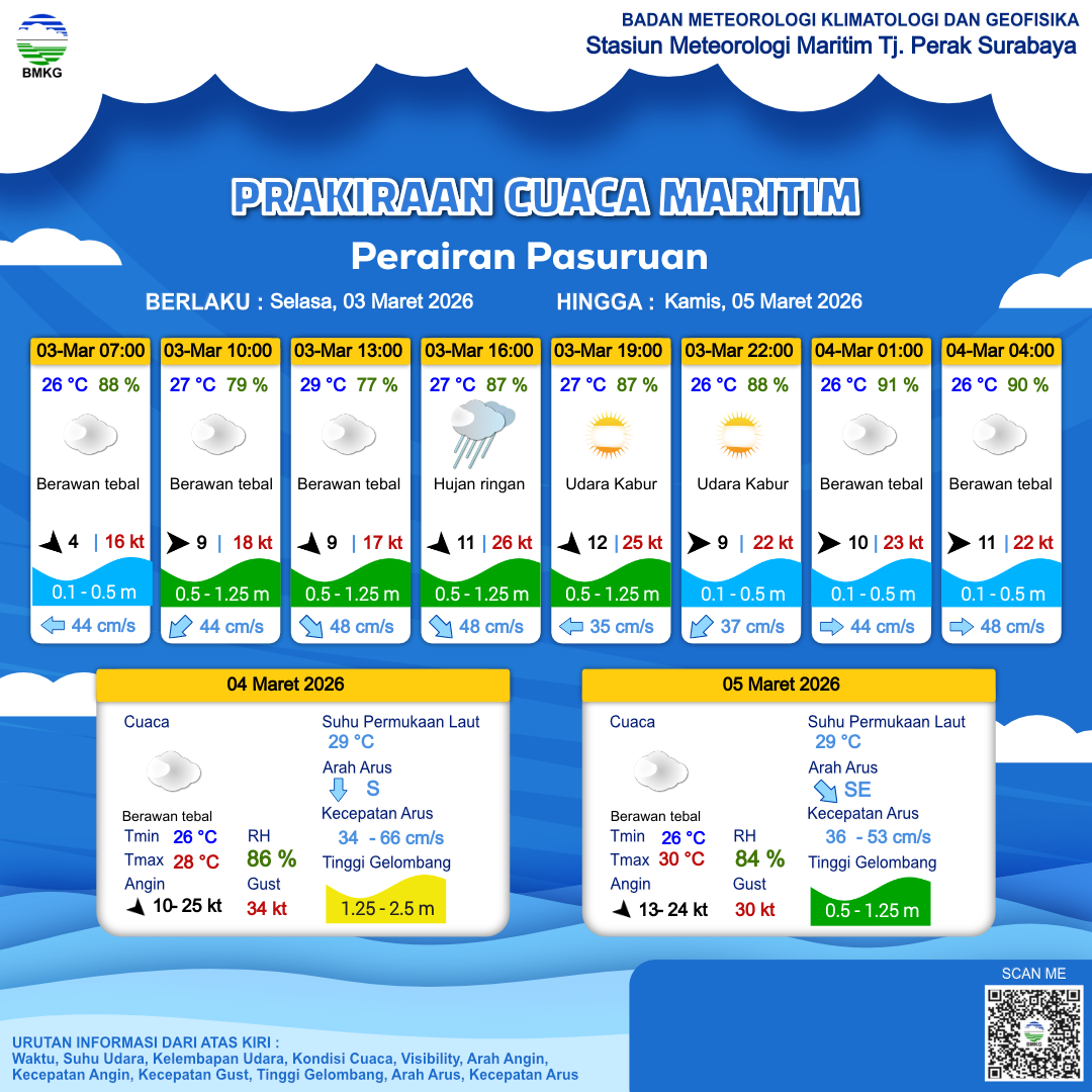 3 Mar 26, 22.00 24 jam kedepan | Barat 11 kt Gust Peningkatan kecepatan angin yang singkat dan tiba-tiba : 23 kt | 0.2 m Tenang | Timur Laut 42.0 cm/s | 26 °C | 90 % | |