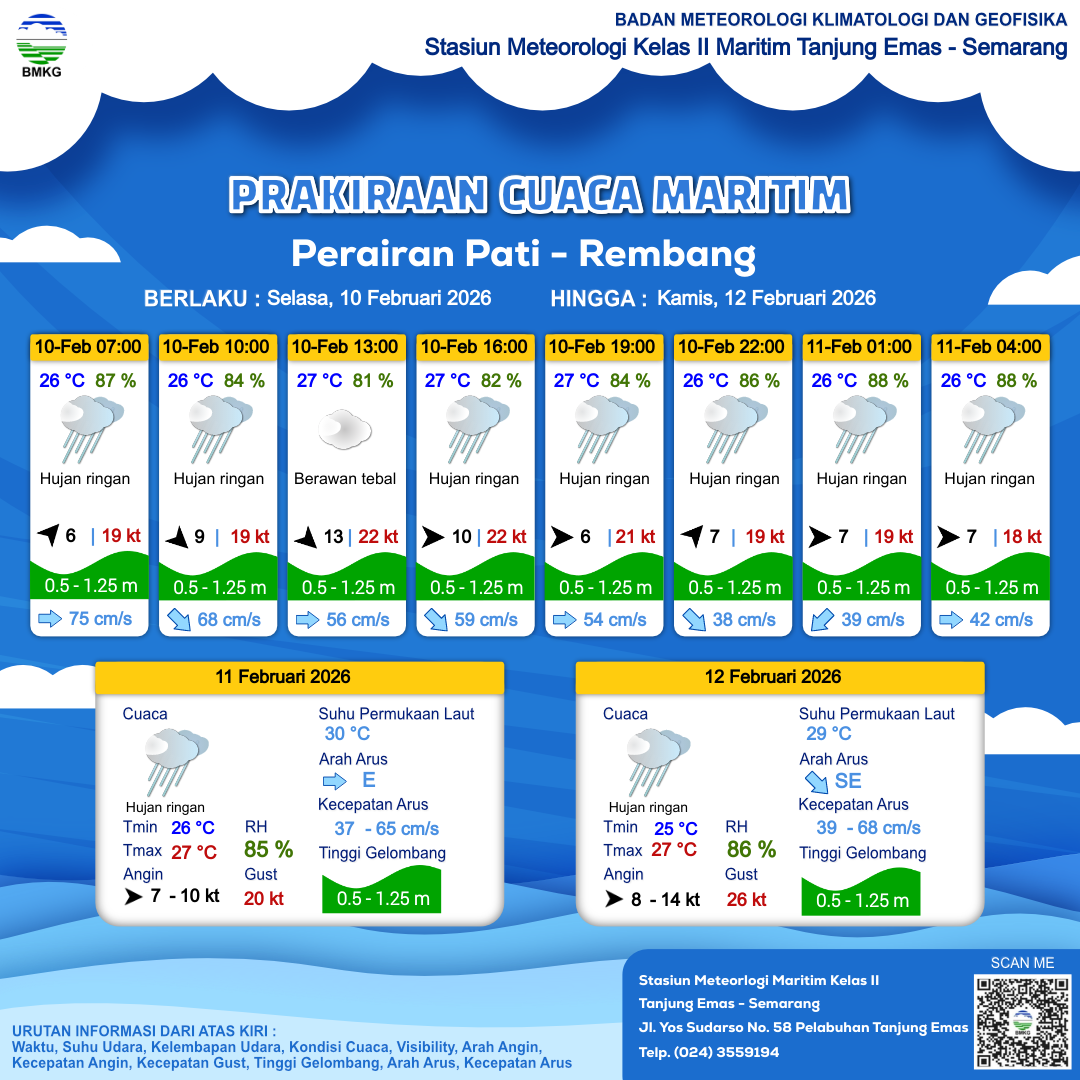 10 Feb 26, 21.00 4 jam kedepan | Hujan Ringan | Barat 7 kt Gust Peningkatan kecepatan angin yang singkat dan tiba-tiba : 18 kt | | | 26 °C | 88 % |