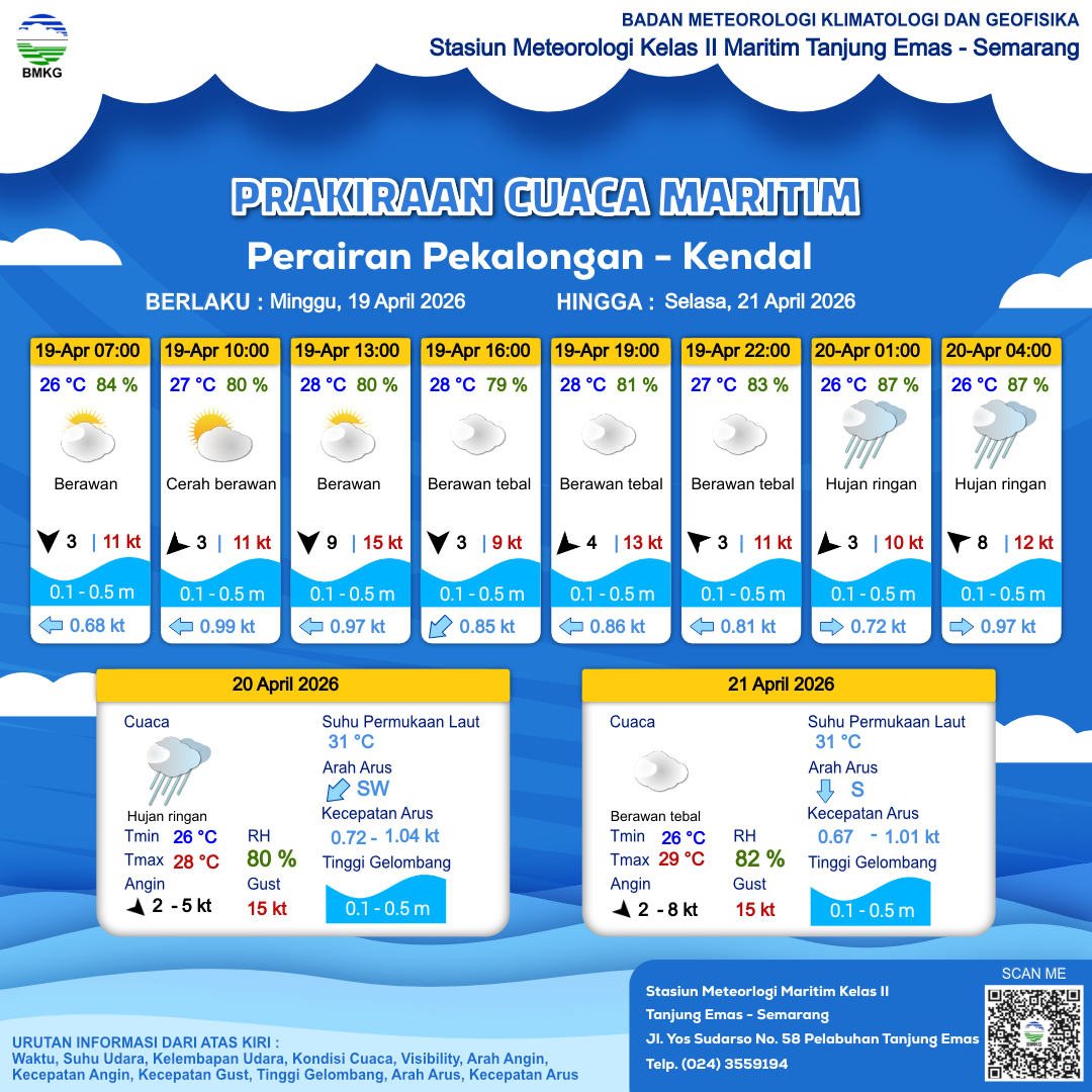 20 Apr 26, 09.00 3 jam kedepan | Utara 5 kt Gust Peningkatan kecepatan angin yang singkat dan tiba-tiba : 10 kt | 0.4 m Tenang | Barat Daya 0.9 Knots | 28 °C | 77 % | |