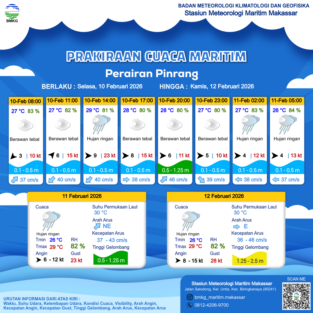 10 Feb 26, 23.00 6 jam kedepan | Hujan Ringan | Barat 7 kt Gust Peningkatan kecepatan angin yang singkat dan tiba-tiba : 15 kt | | | 26 °C | 86 % |