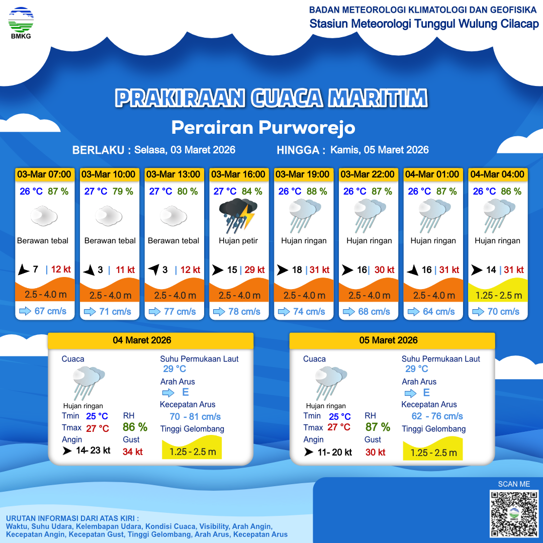3 Mar 26, 13.00 15 jam kedepan | Barat 18 kt Gust Peningkatan kecepatan angin yang singkat dan tiba-tiba : 31 kt | 3 m Tinggi | Timur 75.0 cm/s | 26 °C | 87 % | |