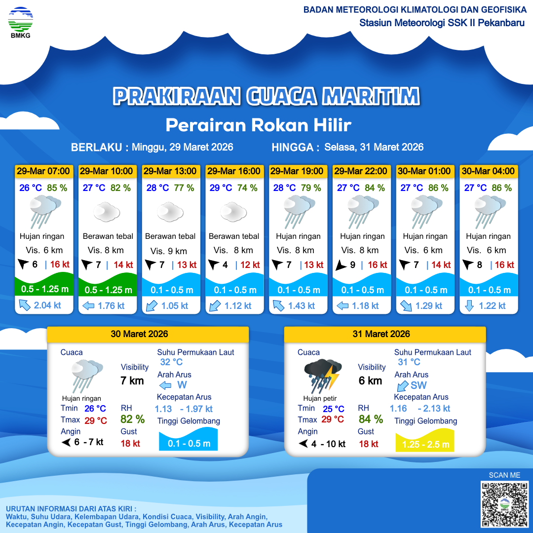 29 Mar 26, 11.00 2 jam kedepan | Tenggara 7 kt Gust Peningkatan kecepatan angin yang singkat dan tiba-tiba : 12 kt | 0.5 m Rendah | Barat 1.3 Knots | 28 °C | 77 % | |