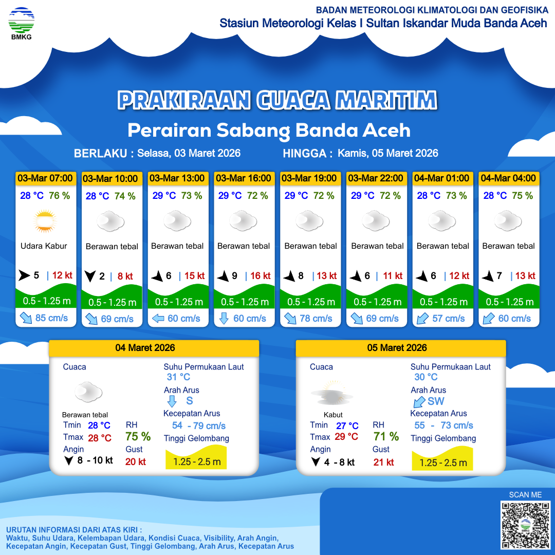 3 Mar 26, 01.00 3 jam kedepan | Barat 5 kt Gust Peningkatan kecepatan angin yang singkat dan tiba-tiba : 10 kt | 1 m Rendah | Tenggara 84.0 cm/s | 28 °C | 76 % | |