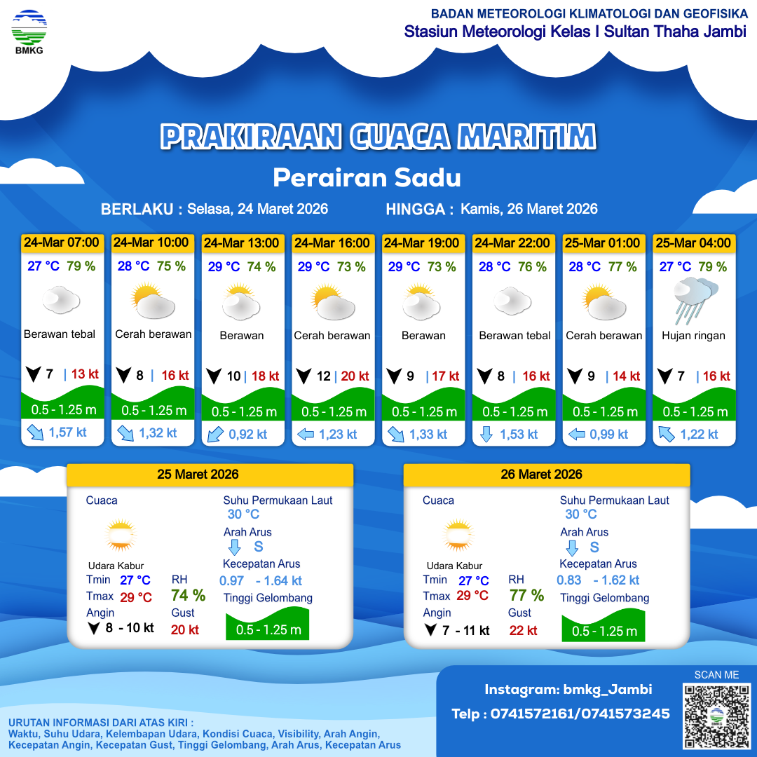 24 Mar 26, 06.00 6 jam kedepan | Utara 10 kt Gust Peningkatan kecepatan angin yang singkat dan tiba-tiba : 18 kt | 0.6 m Rendah | Barat Daya 0.9 Knots | 29 °C | 74 % | |