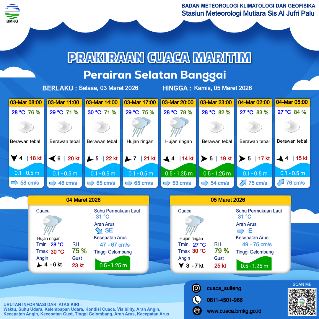 3 Mar 26, 16.00 18 jam kedepan | Barat 5 kt Gust Peningkatan kecepatan angin yang singkat dan tiba-tiba : 19 kt | 0.5 m Rendah | Timur Laut 60.0 cm/s | 28 °C | 82 % | |
