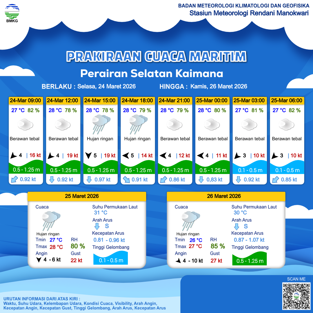 24 Mar 26, 16.00 16 jam kedepan | Timur 4 kt Gust Peningkatan kecepatan angin yang singkat dan tiba-tiba : 10 kt | 0.6 m Rendah | Selatan 0.8 Knots | 28 °C | 80 % | |