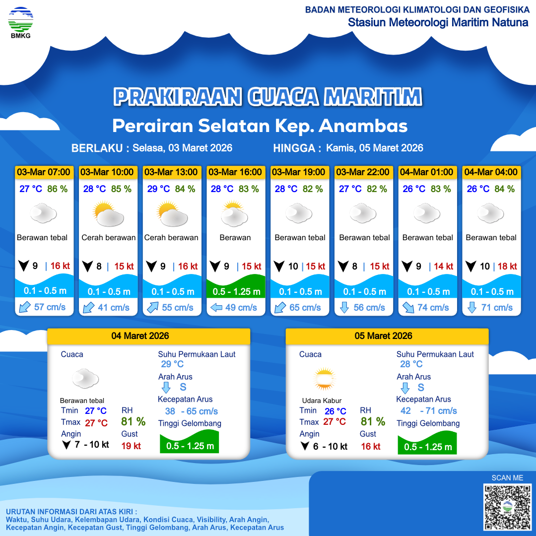 3 Mar 26, 15.00 17 jam kedepan | Utara 8 kt Gust Peningkatan kecepatan angin yang singkat dan tiba-tiba : 15 kt | 0.5 m Rendah | Selatan 56.0 cm/s | 27 °C | 82 % | |