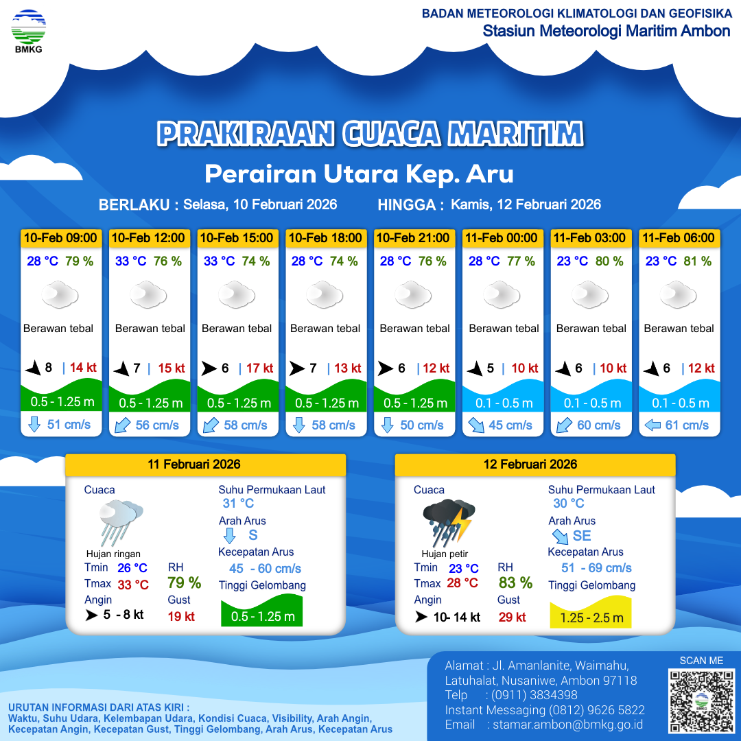 10 Feb 26, 22.00 5 jam kedepan | Barat 8 kt Gust Peningkatan kecepatan angin yang singkat dan tiba-tiba : 20 kt | 0.8 m Rendah | Selatan 55.0 cm/s | 25 °C | 82 % | |