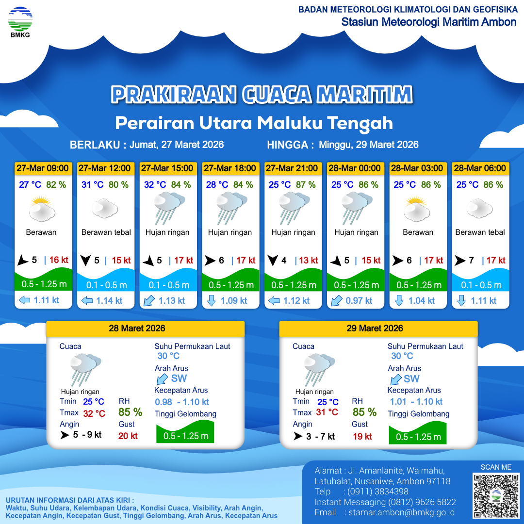 27 Mar 26, 20.00 12 jam kedepan | Barat 9 kt Gust Peningkatan kecepatan angin yang singkat dan tiba-tiba : 20 kt | 0.5 m Rendah | Barat 0.9 Knots | 25 °C | 85 % | |