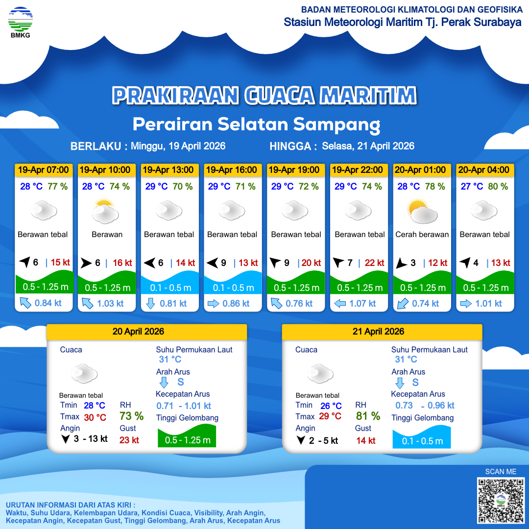 20 Apr 26, 12.00 6 jam kedepan | Tenggara 13 kt Gust Peningkatan kecepatan angin yang singkat dan tiba-tiba : 23 kt | 0.2 m Tenang | Timur 0.7 Knots | 29 °C | 77 % | |