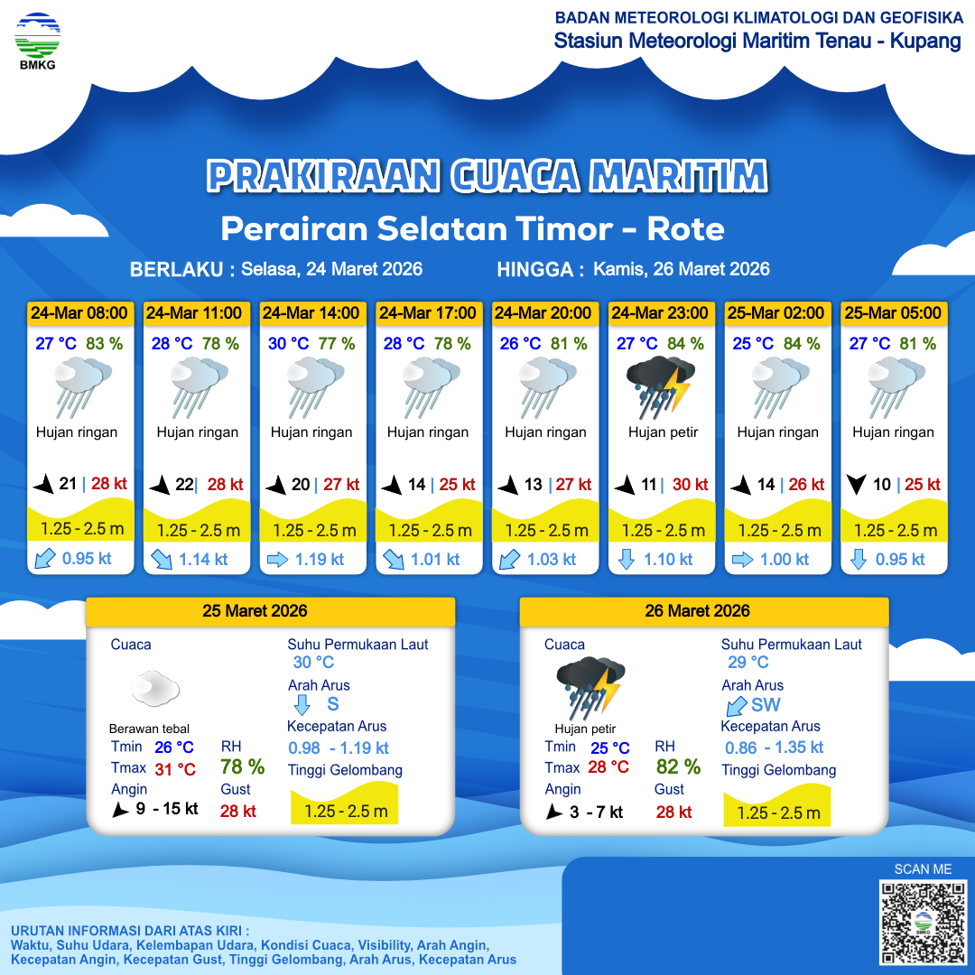24 Mar 26, 23.00 23 jam kedepan | Utara 15 kt Gust Peningkatan kecepatan angin yang singkat dan tiba-tiba : 26 kt | 2.1 m Sedang | Selatan 0.9 Knots | 27 °C | 80 % |