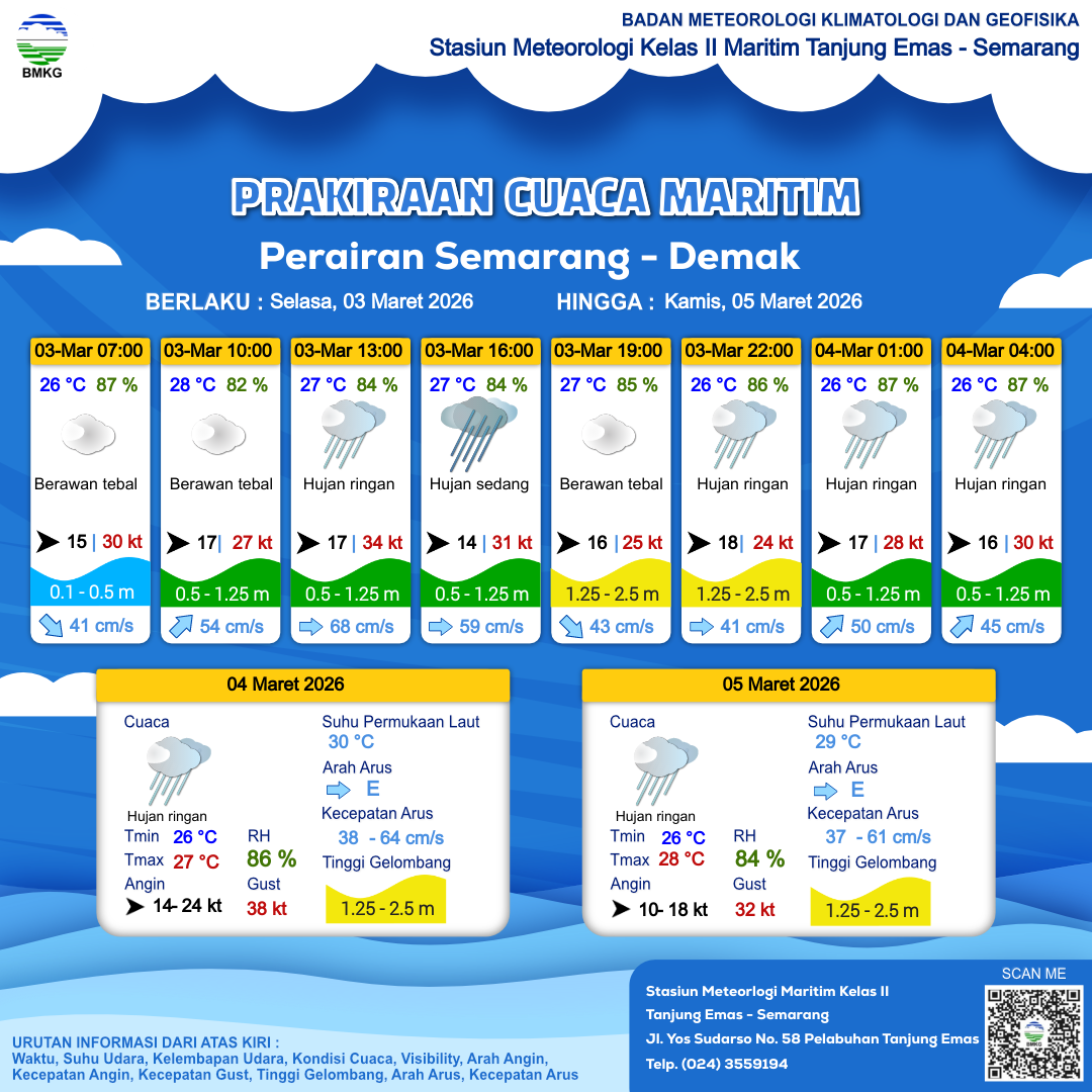 3 Mar 26, 03.00 5 jam kedepan | Barat 17 kt Gust Peningkatan kecepatan angin yang singkat dan tiba-tiba : 27 kt | 1.1 m Rendah | Timur Laut 54.0 cm/s | 28 °C | 82 % | |