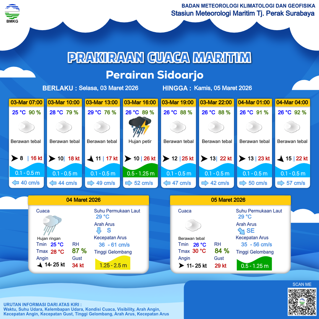 3 Mar 26, 12.00 14 jam kedepan | Barat 12 kt Gust Peningkatan kecepatan angin yang singkat dan tiba-tiba : 25 kt | 0.5 m Rendah | Timur 47.0 cm/s | 26 °C | 88 % | |