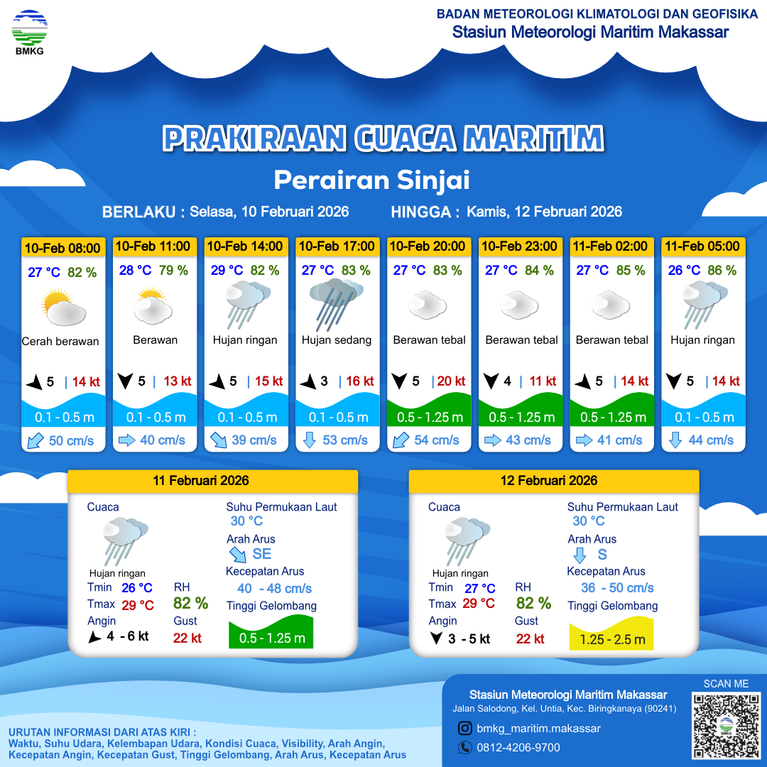 10 Feb 26, 21.00 4 jam kedepan | Hujan Ringan | Utara 5 kt Gust Peningkatan kecepatan angin yang singkat dan tiba-tiba : 14 kt | | | 26 °C | 86 % |
