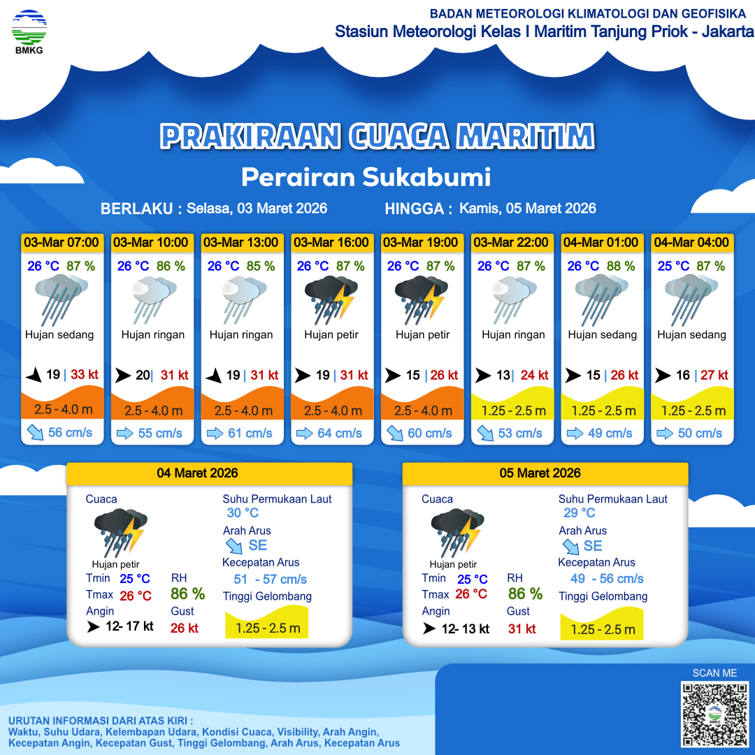 3 Mar 26, 02.00 4 jam kedepan | Barat 20 kt Gust Peningkatan kecepatan angin yang singkat dan tiba-tiba : 33 kt | 2.9 m Tinggi | Timur 54.0 cm/s | 26 °C | 85 % | |