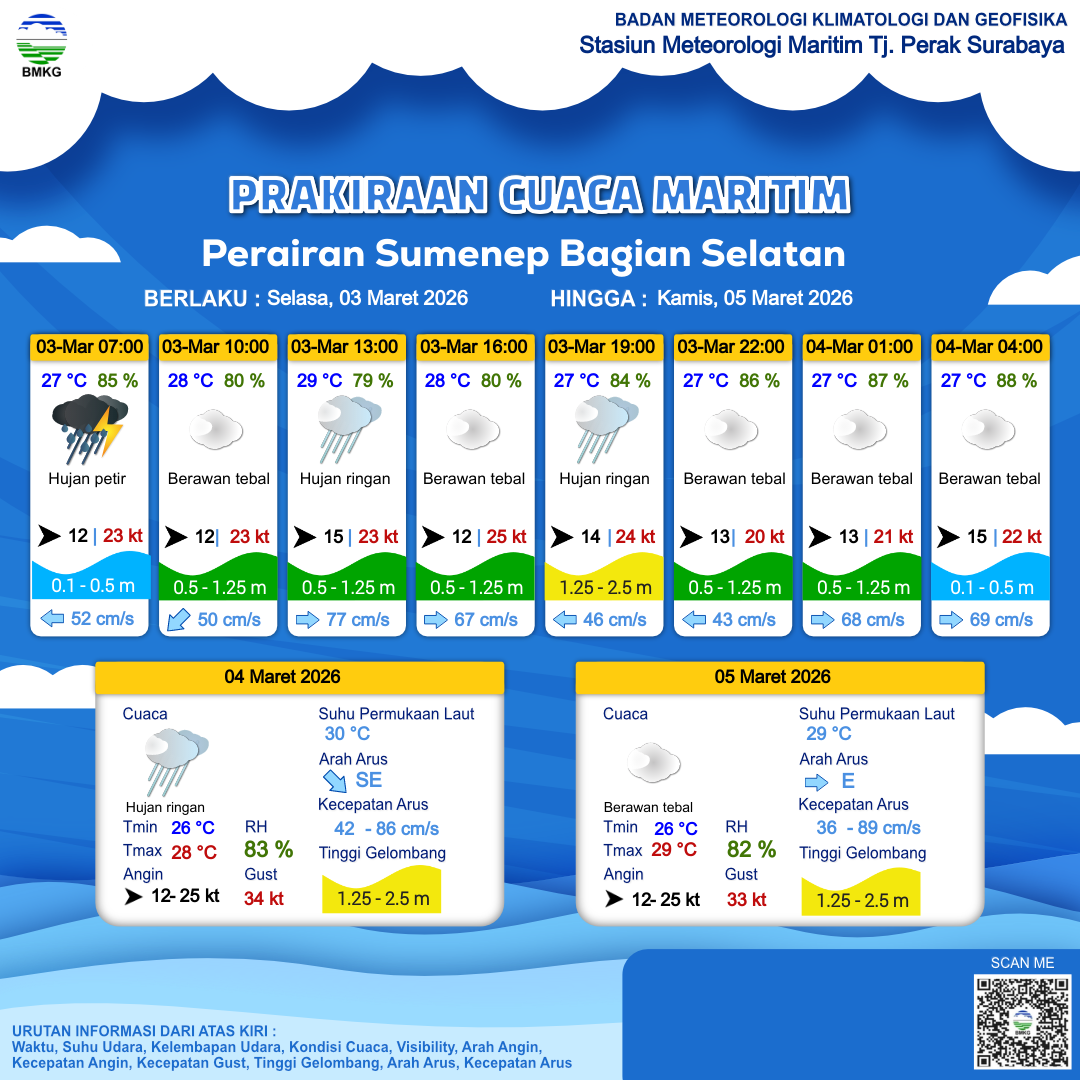 3 Mar 26, 08.00 10 jam kedepan | Barat 12 kt Gust Peningkatan kecepatan angin yang singkat dan tiba-tiba : 25 kt | 0.8 m Rendah | Timur 81.0 cm/s | 28 °C | 80 % | |