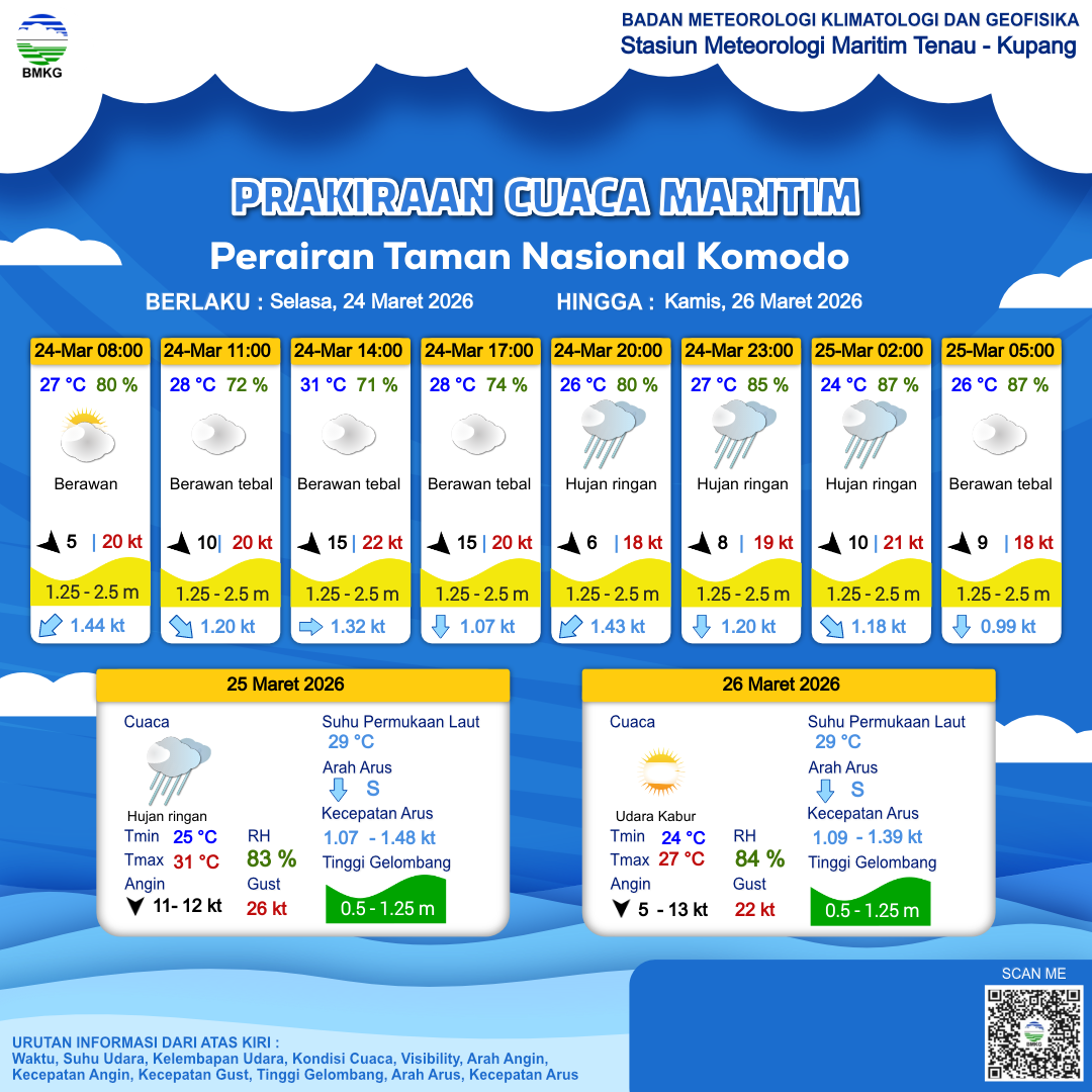 24 Mar 26, 06.00 8 jam kedepan | Barat Laut 15 kt Gust Peningkatan kecepatan angin yang singkat dan tiba-tiba : 22 kt | 1.5 m Sedang | Timur 1.3 Knots | 31 °C | 71 % | |
