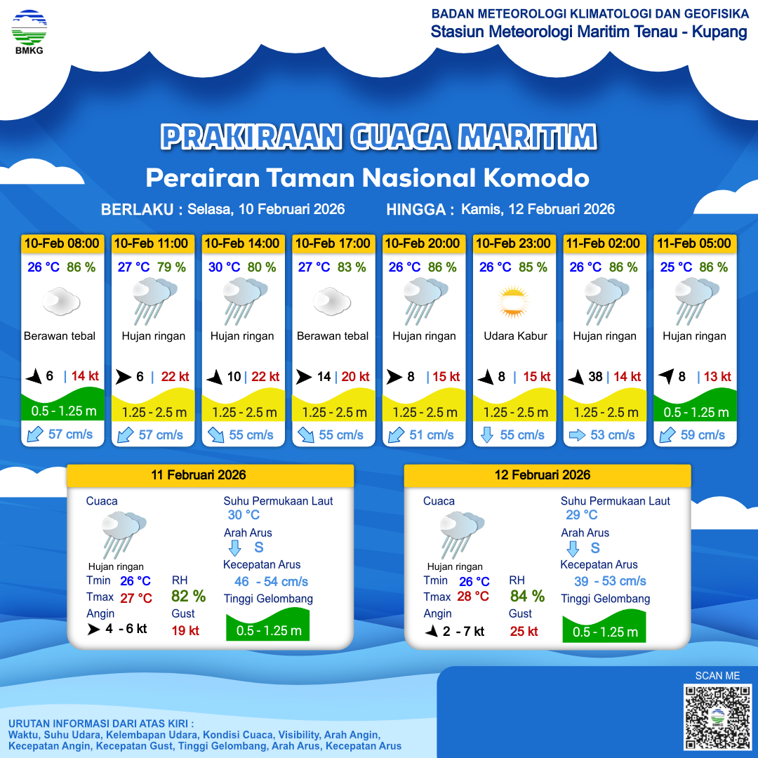 10 Feb 26, 19.00 3 jam kedepan | Barat Laut 8 kt Gust Peningkatan kecepatan angin yang singkat dan tiba-tiba : 13 kt | 1.3 m Sedang | Timur 58.0 cm/s | 25 °C | 86 % | |
