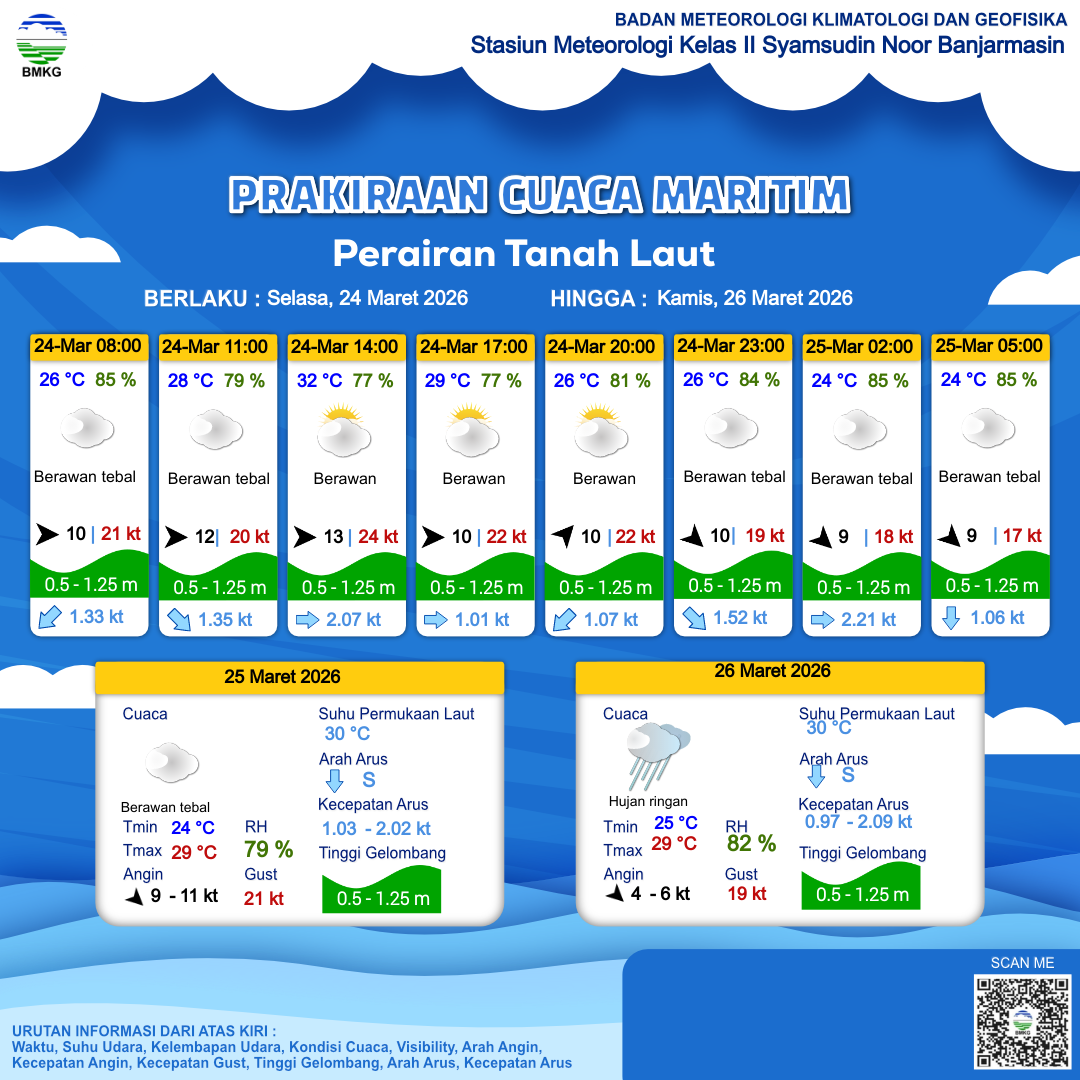 24 Mar 26, 12.00 12 jam kedepan | Barat Daya 10 kt Gust Peningkatan kecepatan angin yang singkat dan tiba-tiba : 22 kt | 0.9 m Rendah | Selatan 1.1 Knots | 26 °C | 81 % | |