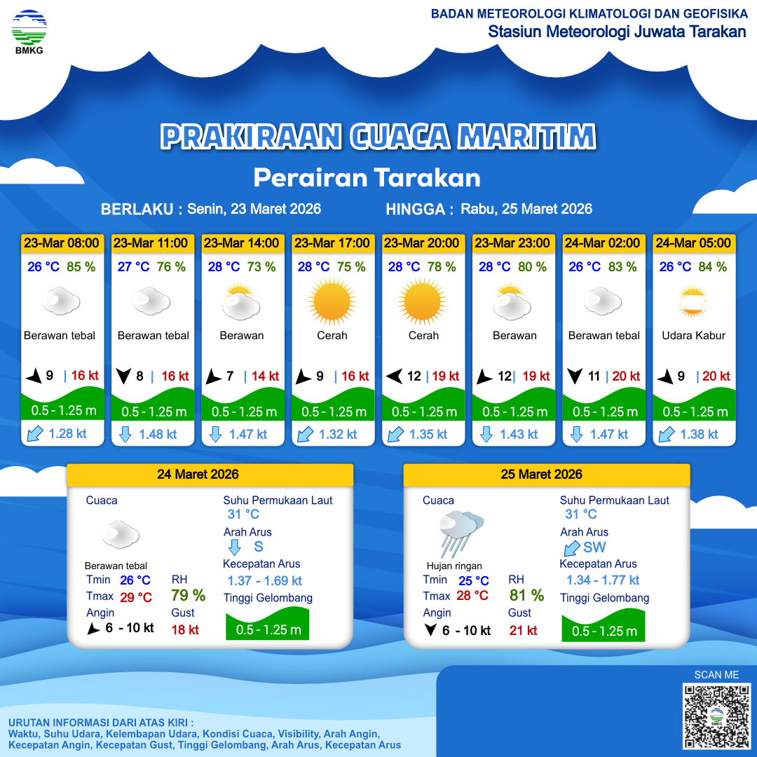 25 Mar 26, 09.00 1 hari 8 jam kedepan | Utara 6 kt Gust Peningkatan kecepatan angin yang singkat dan tiba-tiba : 17 kt | 0.6 m Rendah | Barat Daya 1.5 Knots | 28 °C | 75 % | |