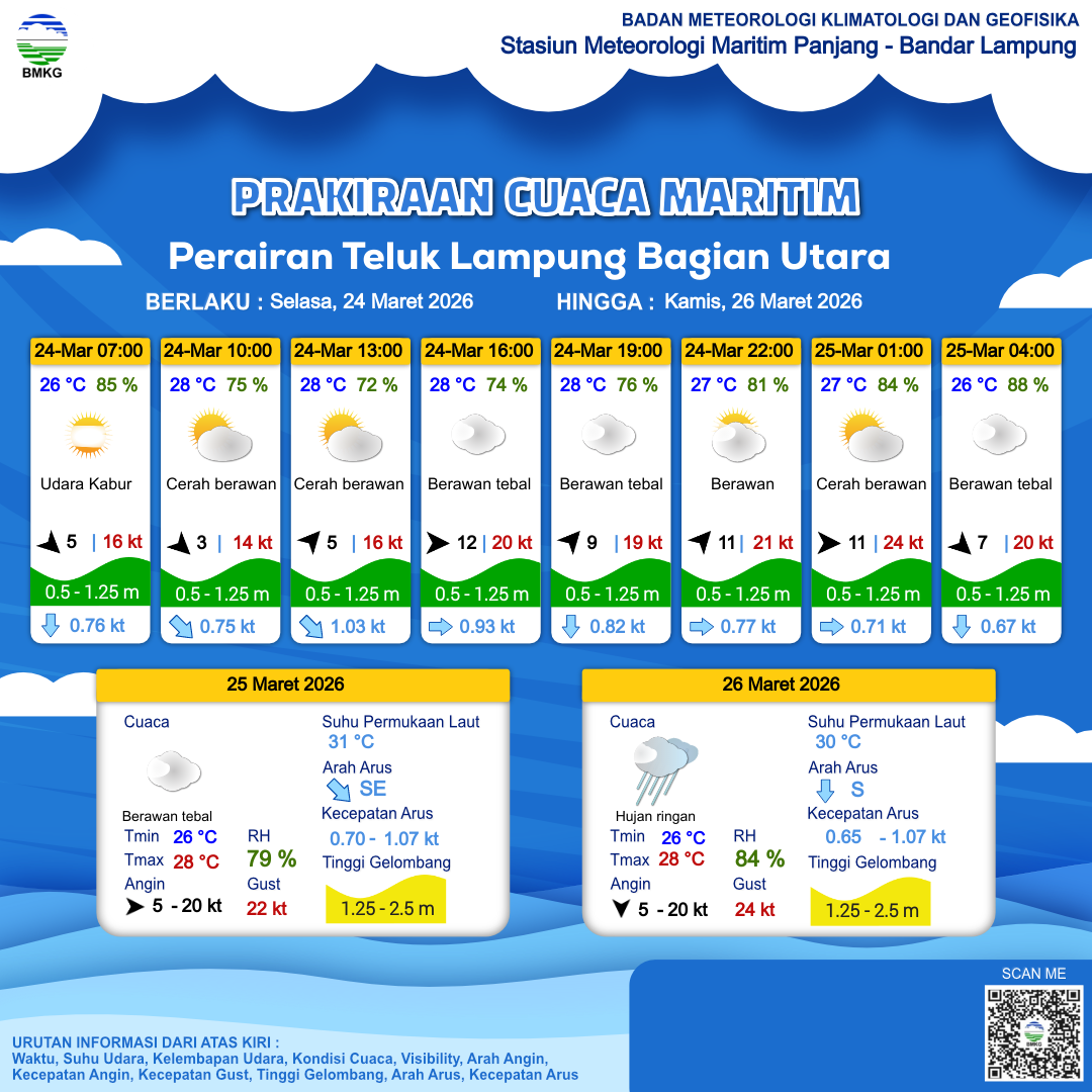 24 Mar 26, 09.00 9 jam kedepan | Barat 12 kt Gust Peningkatan kecepatan angin yang singkat dan tiba-tiba : 20 kt | 1.1 m Rendah | Timur 0.9 Knots | 28 °C | 74 % | |