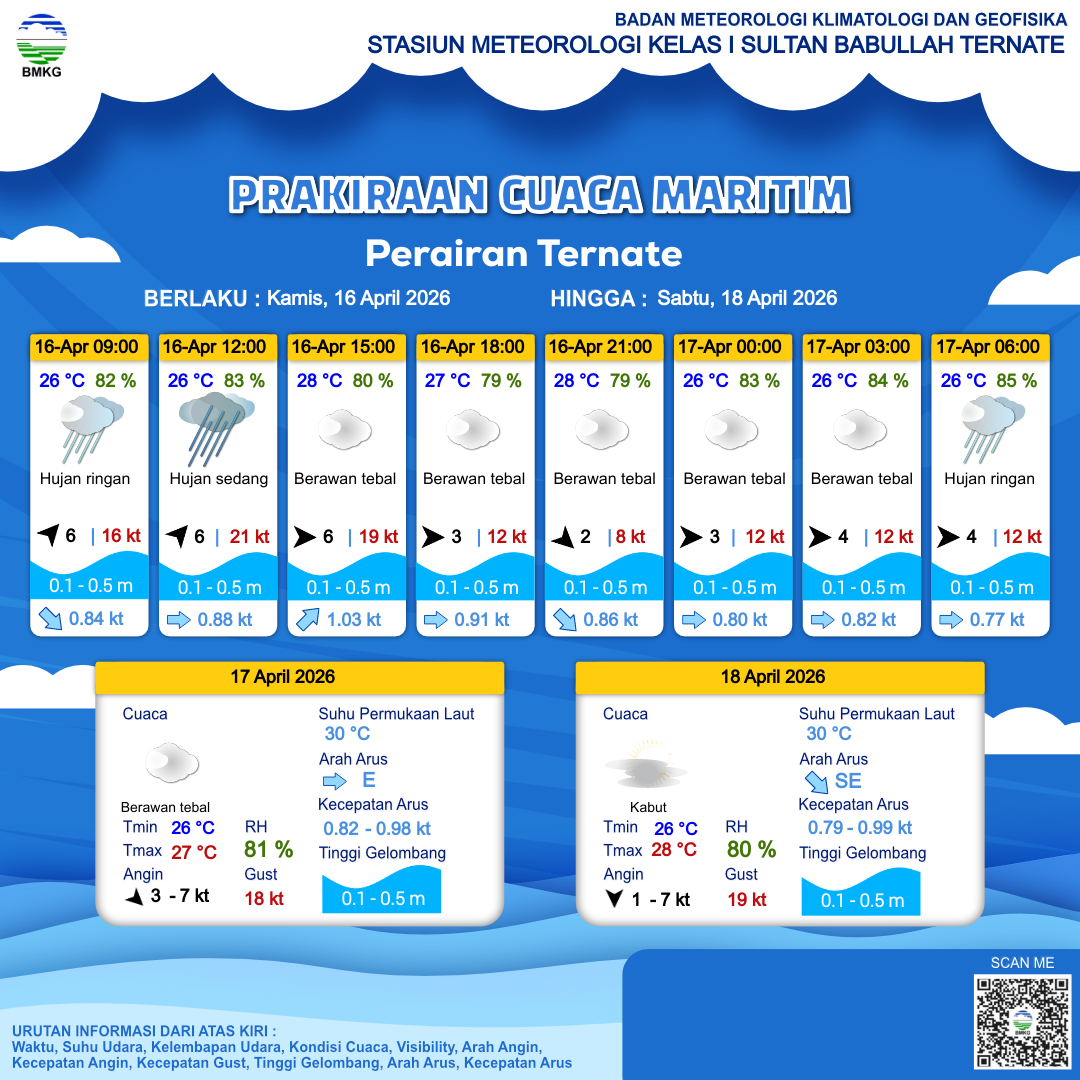 16 Apr 26, 03.00 2 jam kedepan | Barat Daya 6 kt Gust Peningkatan kecepatan angin yang singkat dan tiba-tiba : 21 kt | 0.5 m Rendah | Timur 0.9 Knots | 26 °C | 83 % | |