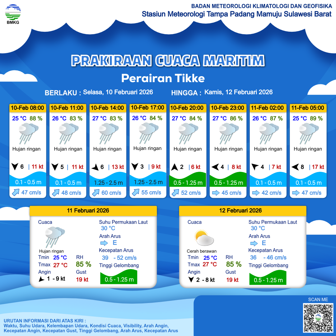 10 Feb 26, 19.00 2 jam kedepan | Timur 3 kt Gust Peningkatan kecepatan angin yang singkat dan tiba-tiba : 13 kt | 0.4 m Tenang | Timur 44.0 cm/s | 25 °C | 89 % | |