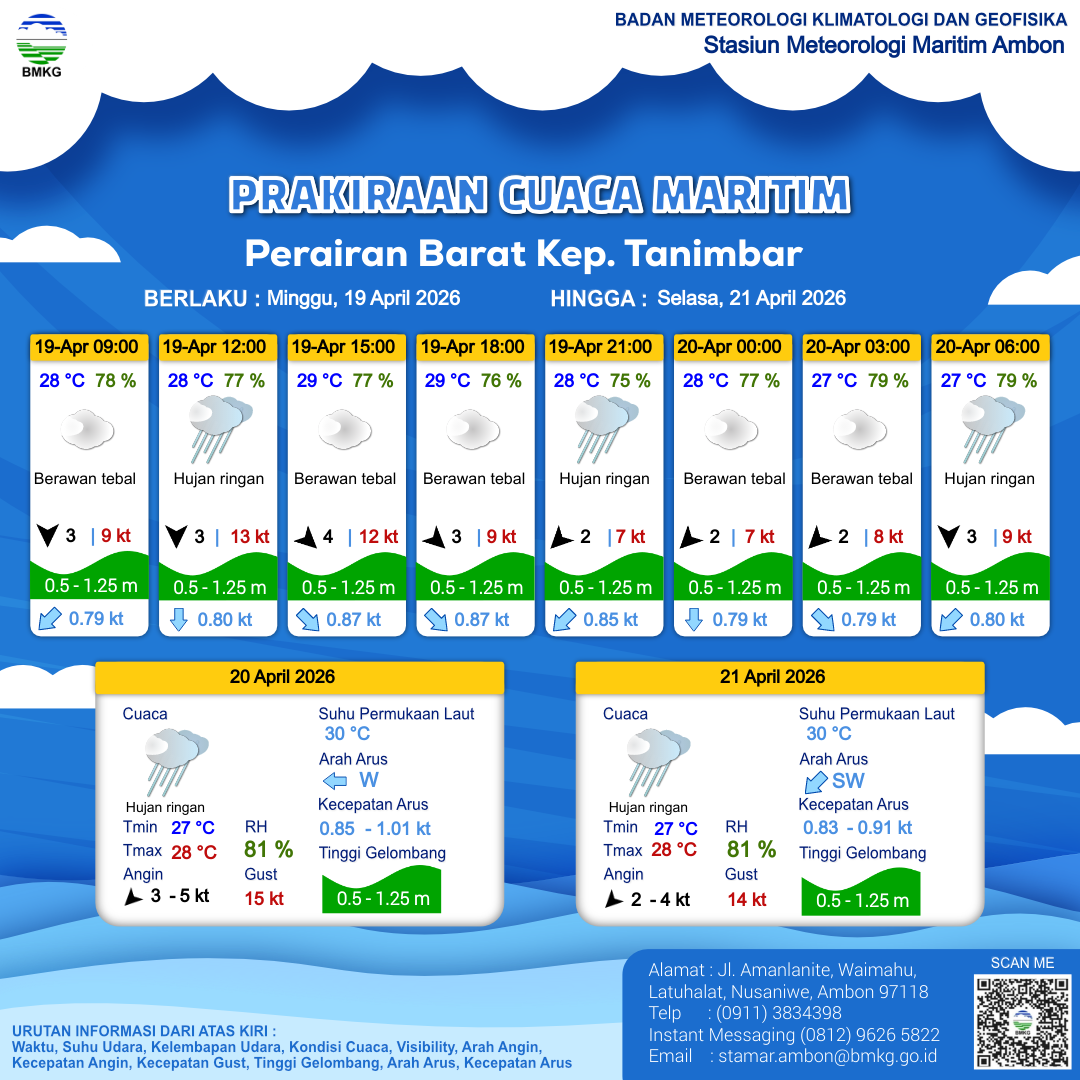 21 Apr 26, 06.00 24 jam kedepan | Utara 2 kt Gust Peningkatan kecepatan angin yang singkat dan tiba-tiba : 12 kt | 0.9 m Rendah | Barat 1.0 Knots | 28 °C | 80 % | |