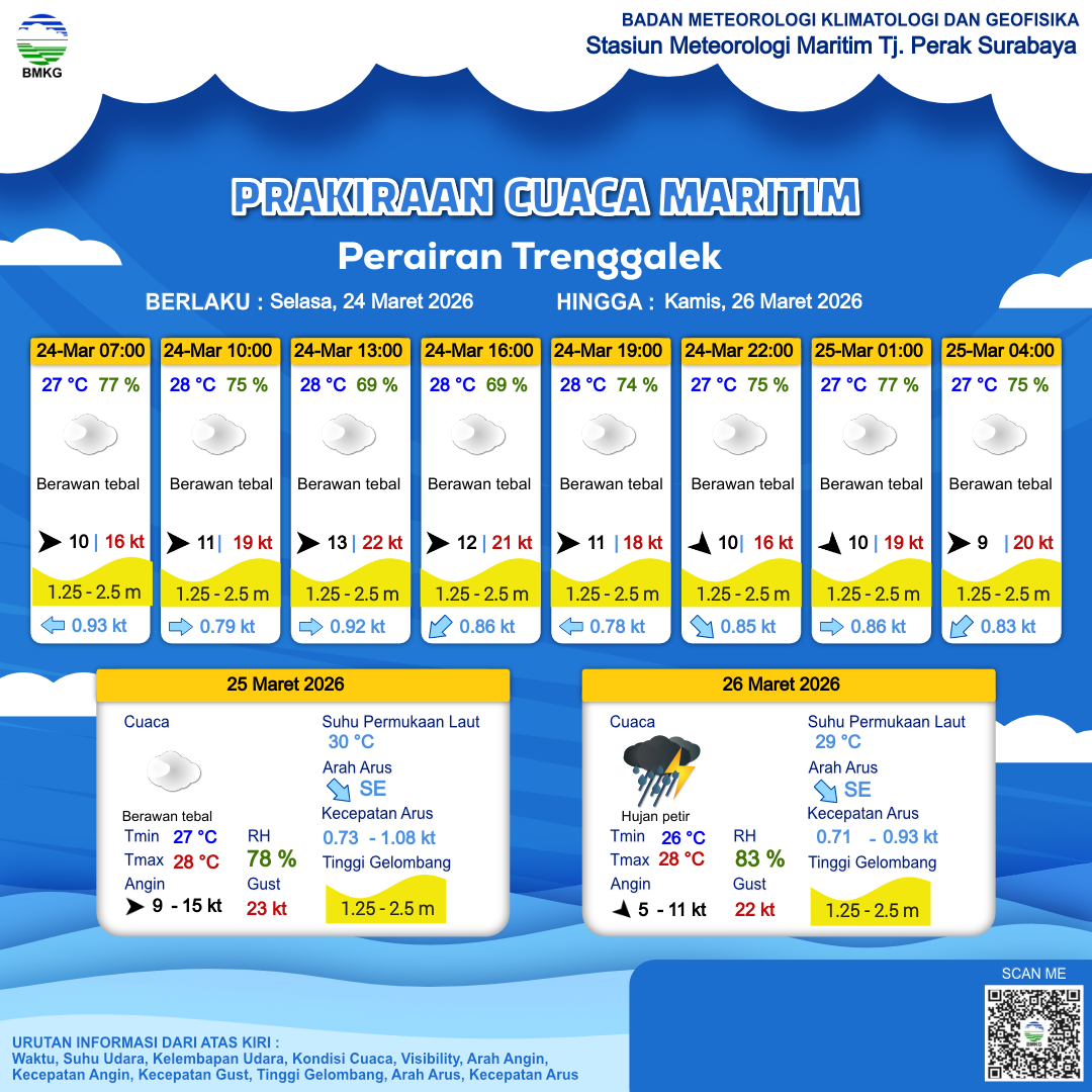 24 Mar 26, 20.00 20 jam kedepan | Barat 9 kt Gust Peningkatan kecepatan angin yang singkat dan tiba-tiba : 20 kt | 1.8 m Sedang | Selatan 0.8 Knots | 27 °C | 77 % | |