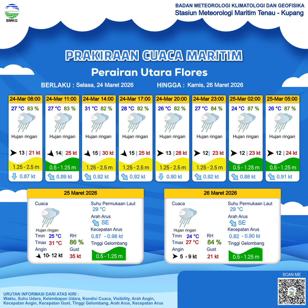 24 Mar 26, 02.00 2 jam kedepan | Barat Laut 14 kt Gust Peningkatan kecepatan angin yang singkat dan tiba-tiba : 22 kt | 1.2 m Rendah | Selatan 0.9 Knots | 27 °C | 82 % | |