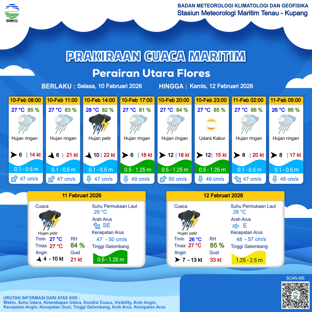10 Feb 26, 21.00 4 jam kedepan | Barat 8 kt Gust Peningkatan kecepatan angin yang singkat dan tiba-tiba : 17 kt | 0.5 m Rendah | Selatan 48.0 cm/s | 26 °C | 86 % | |