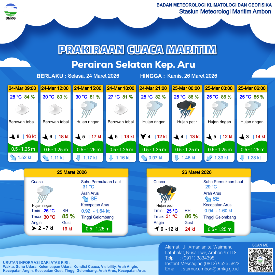 24 Mar 26, 02.00 2 jam kedepan | Utara 6 kt Gust Peningkatan kecepatan angin yang singkat dan tiba-tiba : 15 kt | 0.8 m Rendah | Selatan 1.1 Knots | 29 °C | 80 % | |