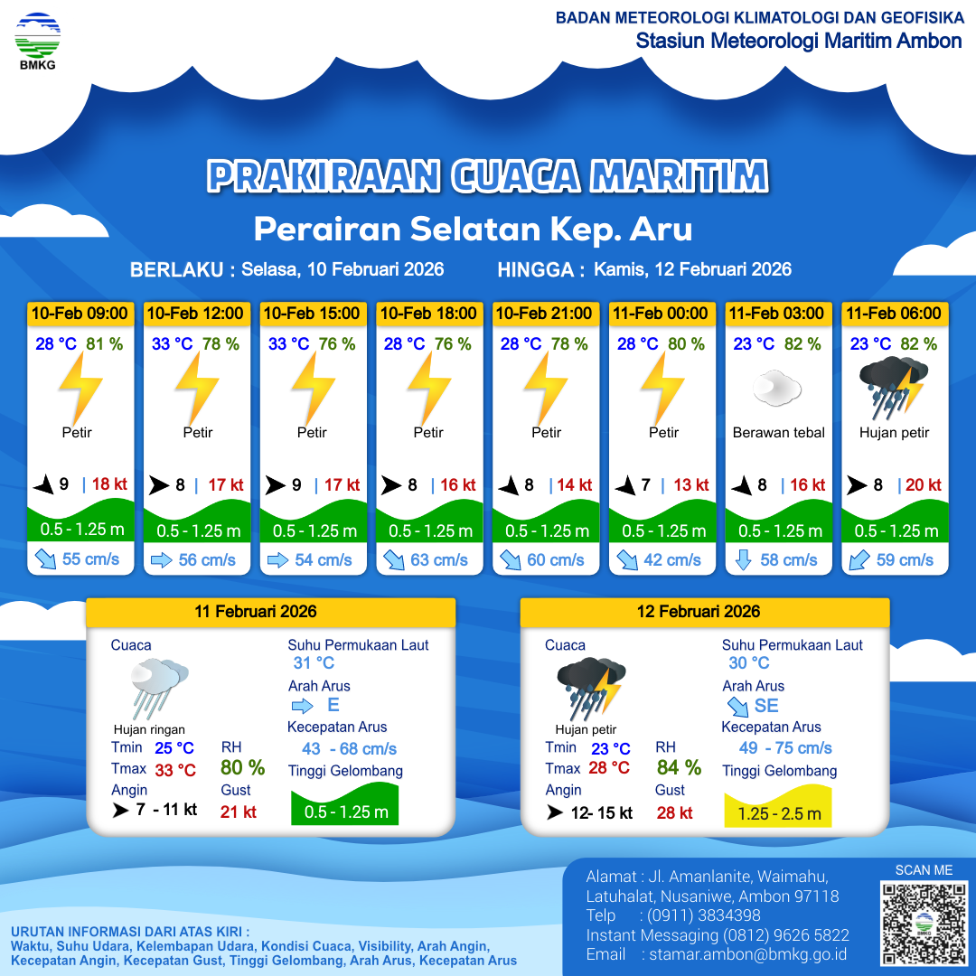 10 Feb 26, 23.00 6 jam kedepan | Barat Laut 5 kt Gust Peningkatan kecepatan angin yang singkat dan tiba-tiba : 11 kt | 0.5 m Rendah | Barat 54.0 cm/s | 26 °C | 81 % |