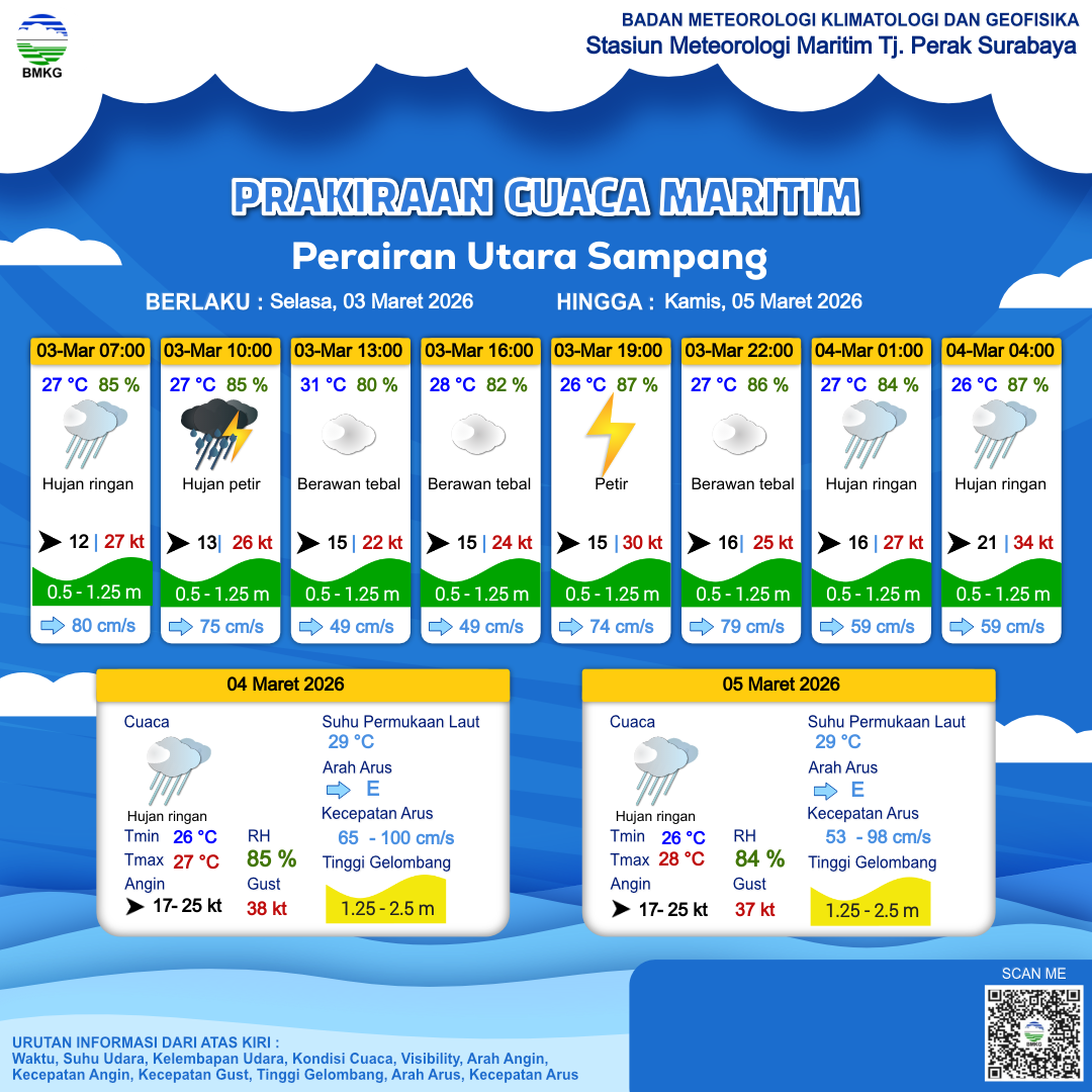 3 Mar 26, 02.00 4 jam kedepan | Barat 13 kt Gust Peningkatan kecepatan angin yang singkat dan tiba-tiba : 22 kt | 0.8 m Rendah | Timur 82.0 cm/s | 27 °C | 83 % | |