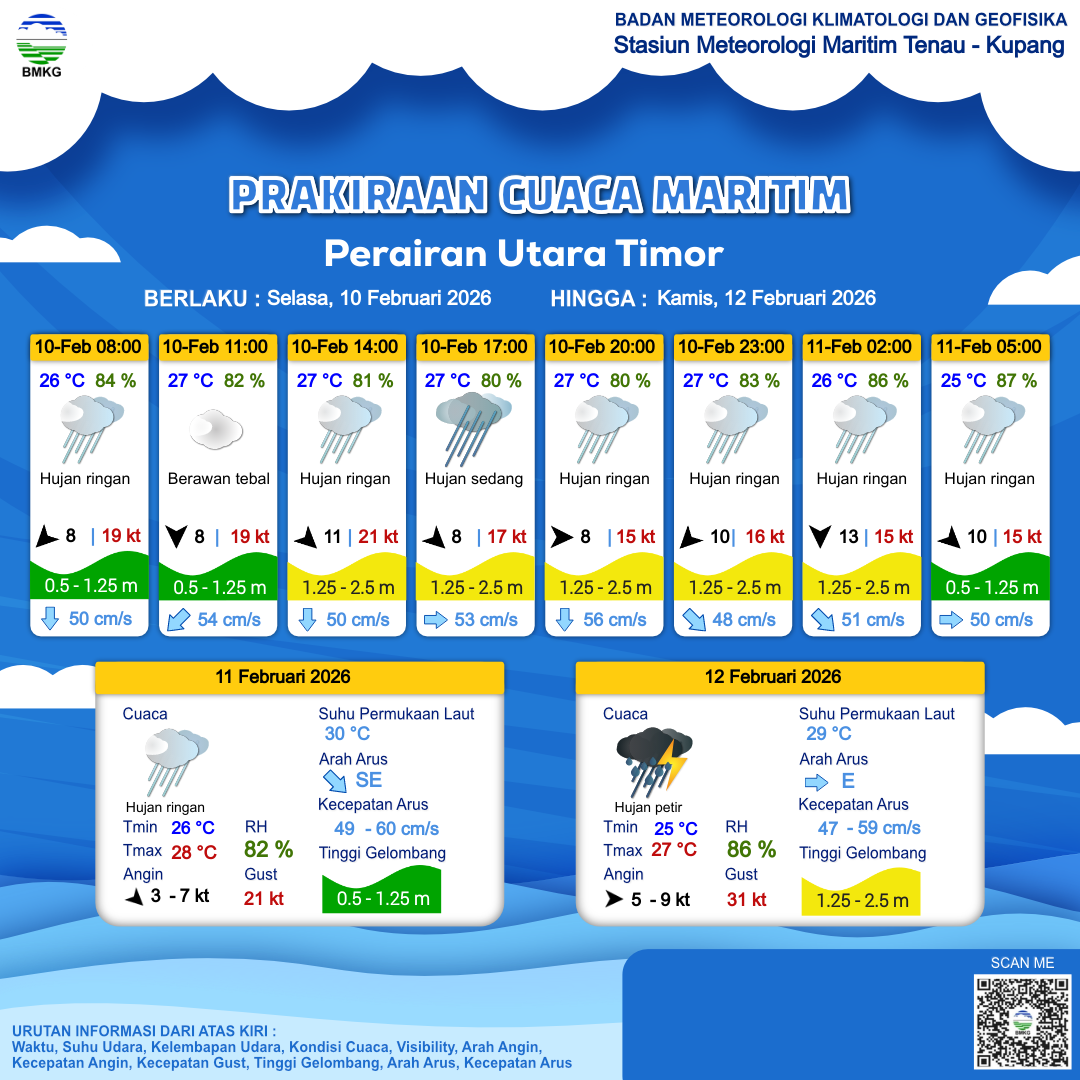 10 Feb 26, 21.00 4 jam kedepan | Barat Laut 10 kt Gust Peningkatan kecepatan angin yang singkat dan tiba-tiba : 15 kt | 1.1 m Rendah | Timur 50.0 cm/s | 25 °C | 87 % | |