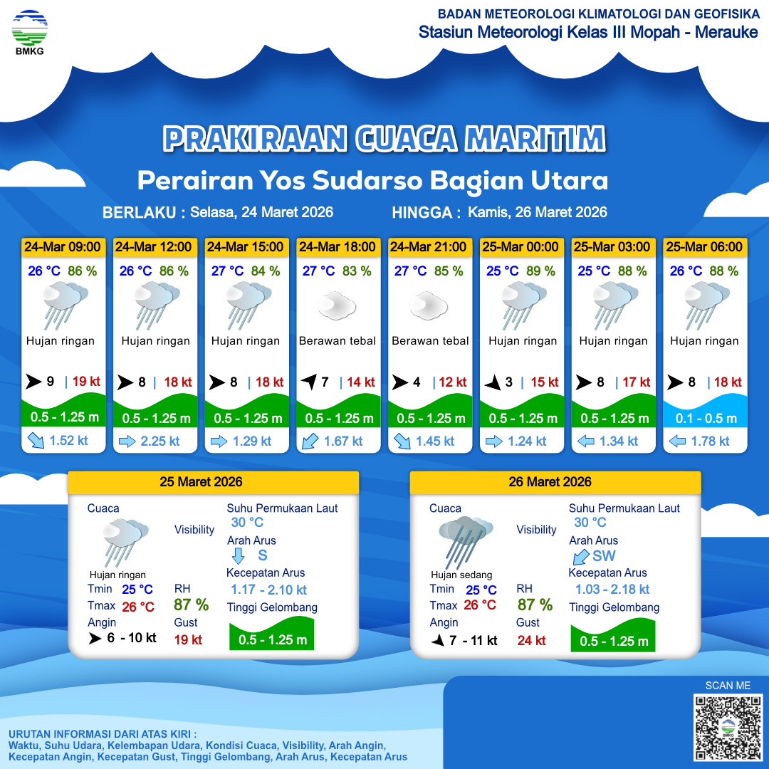 24 Mar 26, 03.00 3 jam kedepan | Barat 8 kt Gust Peningkatan kecepatan angin yang singkat dan tiba-tiba : 18 kt | 0.9 m Rendah | Timur 2.3 Knots | 26 °C | 86 % | |