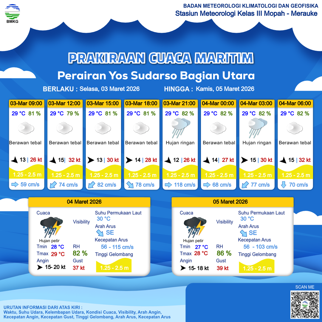3 Mar 26, 08.00 10 jam kedepan | Barat 14 kt Gust Peningkatan kecepatan angin yang singkat dan tiba-tiba : 26 kt | 1.5 m Sedang | Selatan 69.0 cm/s | 29 °C | 80 % | |