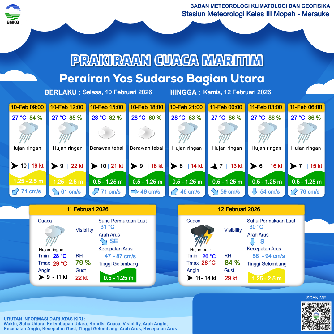 10 Feb 26, 19.00 2 jam kedepan | Barat 6 kt Gust Peningkatan kecepatan angin yang singkat dan tiba-tiba : 16 kt | 0.6 m Rendah | Barat Daya 58.0 cm/s | 27 °C | 86 % | |
