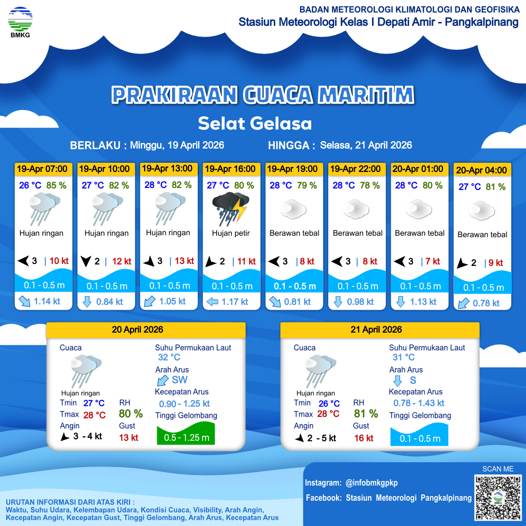 20 Apr 26, 12.00 6 jam kedepan | Timur 4 kt Gust Peningkatan kecepatan angin yang singkat dan tiba-tiba : 13 kt | 0.5 m Rendah | Barat 0.9 Knots | 28 °C | 79 % | |
