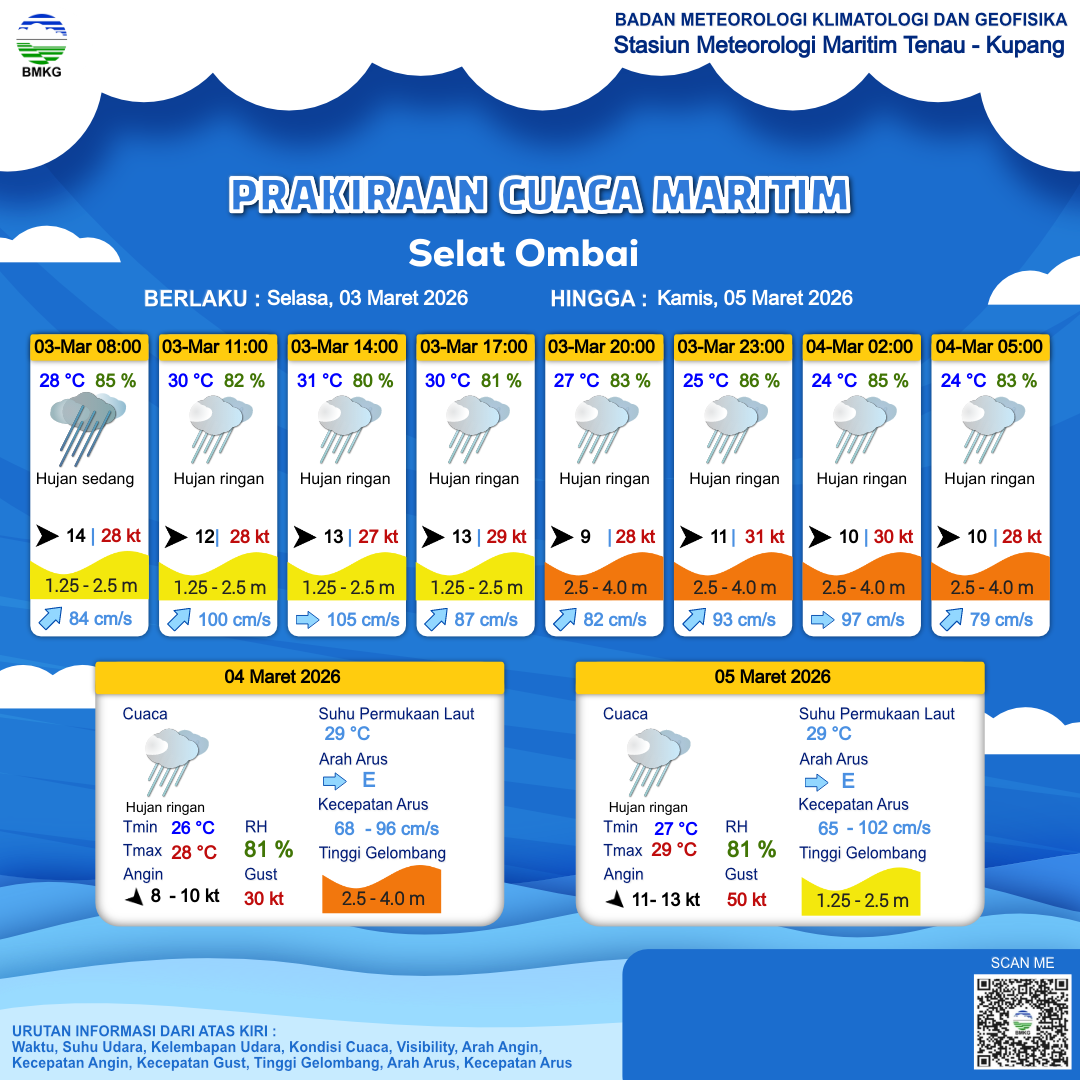 3 Mar 26, 00.00 2 jam kedepan | Barat 14 kt Gust Peningkatan kecepatan angin yang singkat dan tiba-tiba : 28 kt | 2.2 m Sedang | Timur Laut 84.0 cm/s | 28 °C | 85 % | |