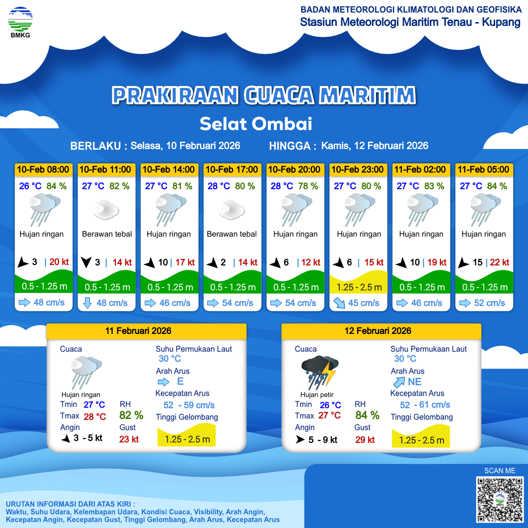 10 Feb 26, 21.00 4 jam kedepan | Timur Laut 15 kt Gust Peningkatan kecepatan angin yang singkat dan tiba-tiba : 22 kt | 1.1 m Rendah | Timur 52.0 cm/s | 27 °C | 84 % | |