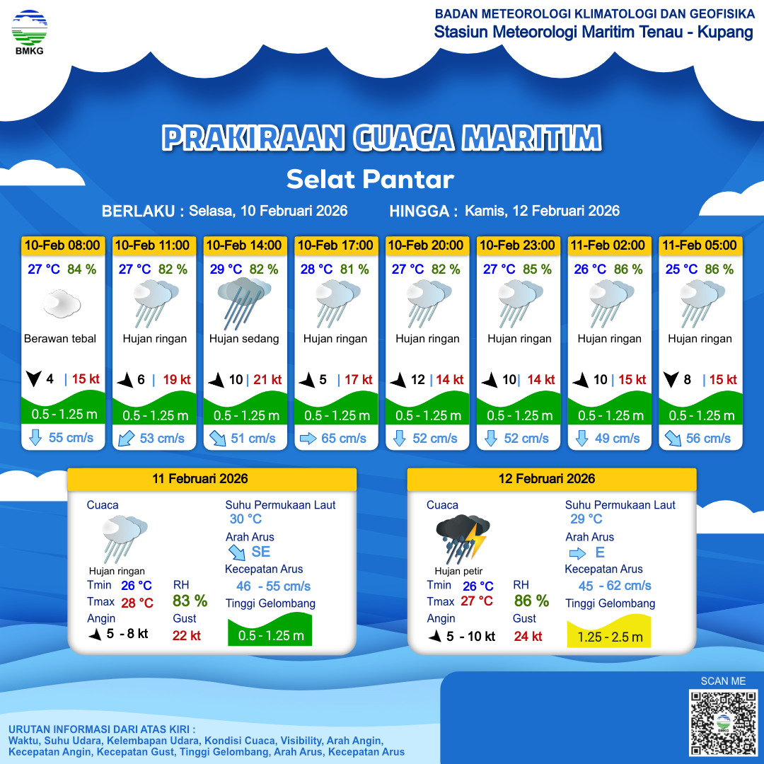 10 Feb 26, 22.00 5 jam kedepan | Hujan Ringan | Utara 8 kt Gust Peningkatan kecepatan angin yang singkat dan tiba-tiba : 14 kt | | | 26 °C | 86 % |
