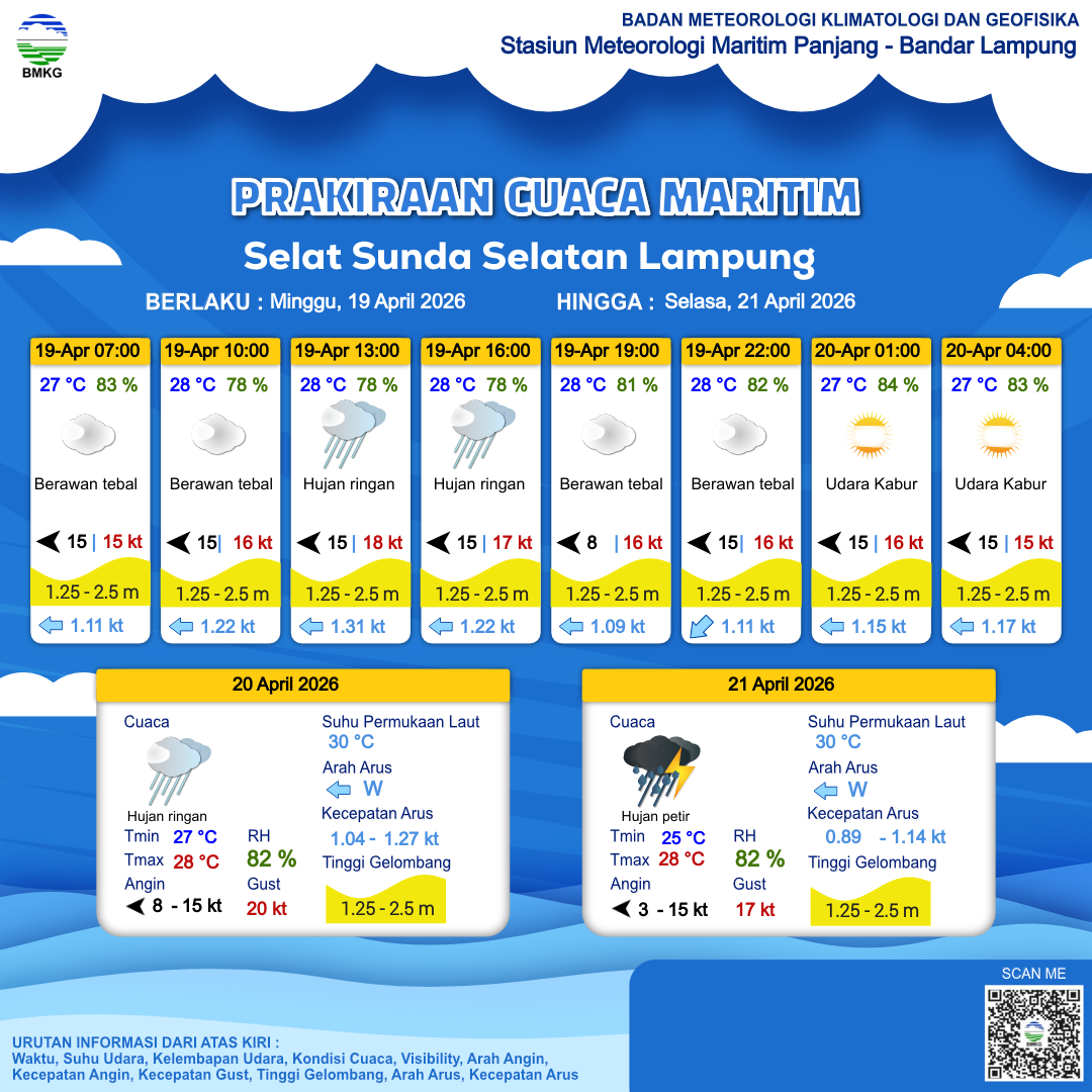 20 Apr 26, 12.00 6 jam kedepan | Tenggara 8 kt Gust Peningkatan kecepatan angin yang singkat dan tiba-tiba : 19 kt | 1.5 m Sedang | Barat 1.0 Knots | 27 °C | 82 % | |