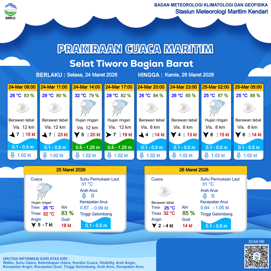 24 Mar 26, 08.00 8 jam kedepan | Barat 7 kt Gust Peningkatan kecepatan angin yang singkat dan tiba-tiba : 17 kt | 0.8 m Rendah | Timur 1.0 Knots | 29 °C | 81 % | |