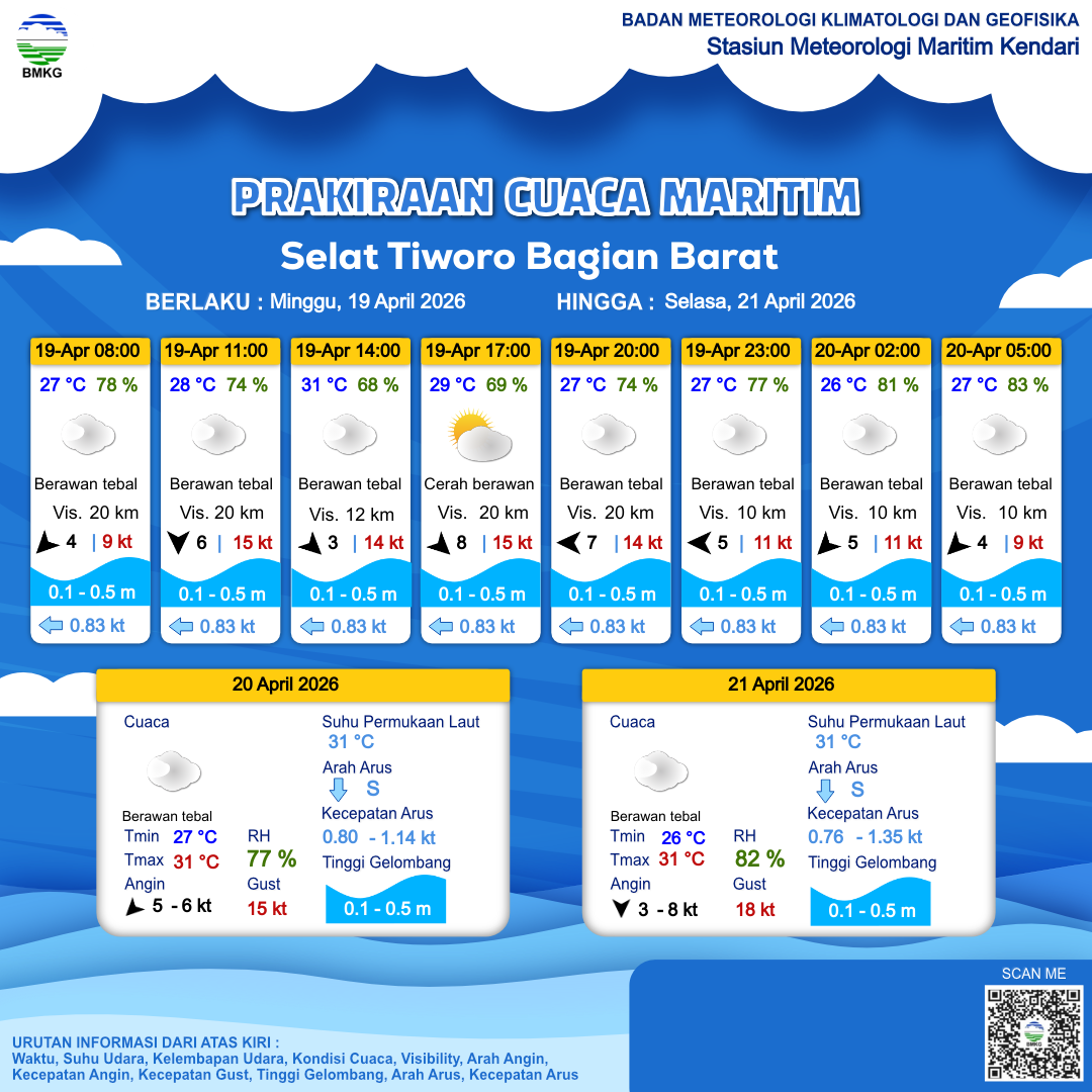 20 Apr 26, 12.00 6 jam kedepan | Timur 5 kt Gust Peningkatan kecepatan angin yang singkat dan tiba-tiba : 11 kt | 0.5 m Rendah | Barat Daya 1.1 Knots | 28 °C | 81 % | |