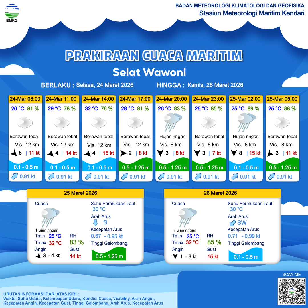 24 Mar 26, 06.00 6 jam kedepan | Barat Laut 4 kt Gust Peningkatan kecepatan angin yang singkat dan tiba-tiba : 15 kt | 0.5 m Rendah | Barat 0.9 Knots | 32 °C | 76 % | |
