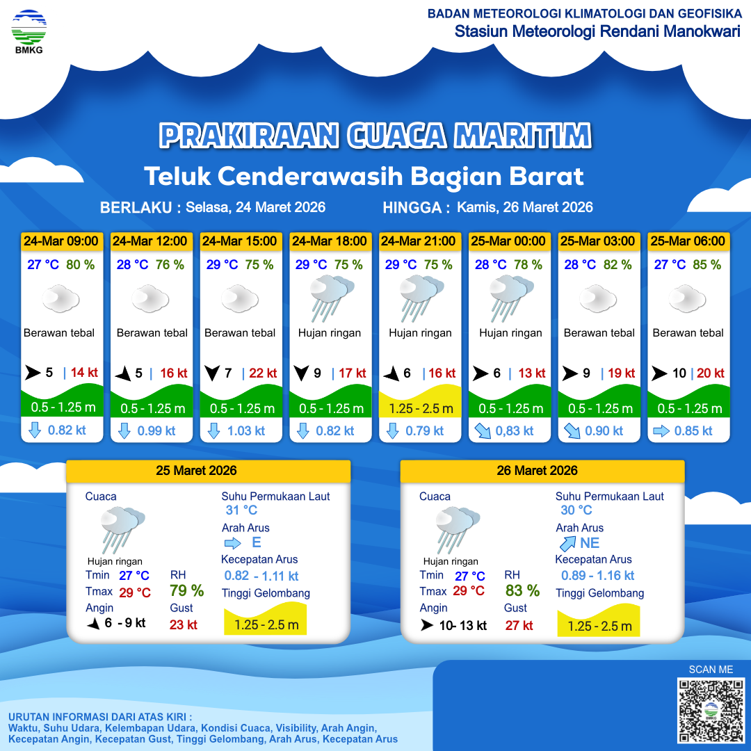 24 Mar 26, 23.00 23 jam kedepan | Barat 9 kt Gust Peningkatan kecepatan angin yang singkat dan tiba-tiba : 18 kt | 1 m Rendah | Timur 0.9 Knots | 27 °C | 84 % |